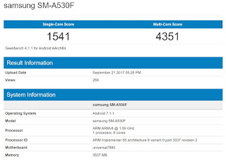 Samsung is all set to introduce the 2018 lineup of a mid-range smartphone with Samsung Galaxy A series 2018 edition.Now, we have spotted the Samsung Galaxy A5 2018 edition on GeekBench which is listed as SM-A530F and earlier launched A5 2017 edition had model number SM-A520F so we can tell that the device is the upcoming Samsung Galaxy A5 2018 edition.