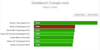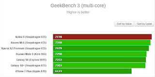 From the above results we can see that Nokia 9 with multi core score of 7770 is top performer with all other popular flagship smartphones below it.The above results were been tested on outdated version of Geekbench 3.It also score 2255 for Single core test which is just below Apple iPhone 7.