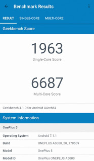OnePlus 5 with model number A5000 is running Android 7.1.1 out of the box and has single core test score of 1963 points & 6687 in multi-core test.If we compare the score of Single core test with iPhone 7 Plus & Samsung Galaxy S8+ then OnePlus 5 is placed at the third position.But in the multi-core test, the OnePlus 5 shines and is at the first position by just 300 points more than Samsung Galaxy S8+.