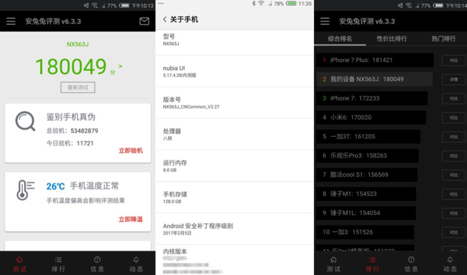 As per the screenshot obtained by Forbes Ben Sin, which was from a reliable source from Shenzen in China.The ZTE Nubia Z17 scored an impressive 1,80,049 points in Antutu Benchmarks, which is much higher than Samsung Galaxy S8+ with Sd 835 chip.