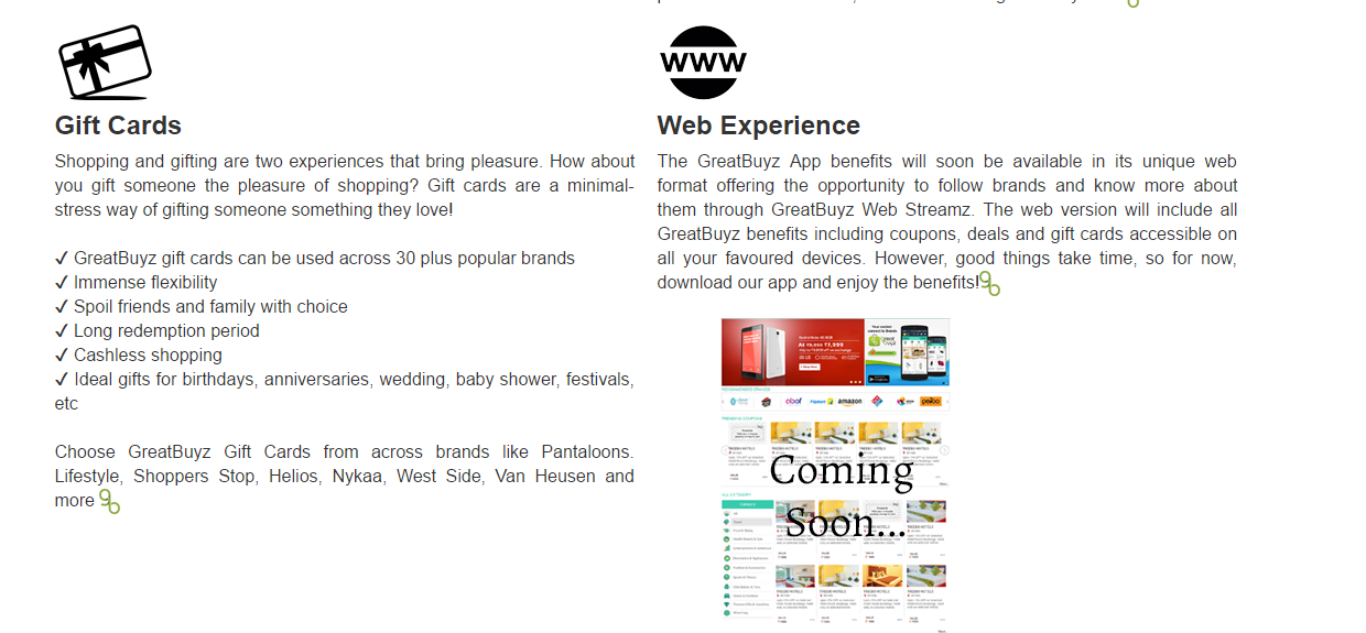 Greatbuyz enhances your shopping experience by making you an informed shopper. It’s like a shopping genie that fulfils your dream of getting irresistible deals and coupons to your fingertips, make gifting easy by bringing all gift card options under one roof and allowing you to block out all spam and unwanted marketing messages and receive relevant updates from your favourite brands through GreatBuyz’ unique Streamz section. You can follow and unfollow your favourite brands at the click of a button, engage with them in a meaningful way, and be the first ones to know about their latest offers. Your wish is our command.