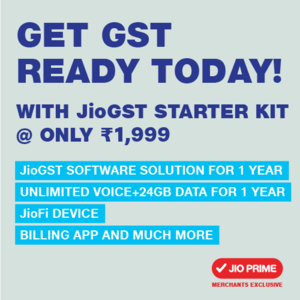 Get GST ready at just Rs 1,999 – The most affordable GST Starter Kit for merchants: The JioGST Starter Kit offers the best value to merchants. A collective objection by small retailers is that GST will increase their operating costs since they will need additional data for GST filing, billing and compliance. JioGST solves this problem by significantly reducing their GST related costs. The cost of GST related services for merchants is around Rs 11,000, but JioGST Starter Kit offers all these services at just Rs 1,999 only, for an entire year. It may sound unbelievable, but this is just another example of disruptive pricing that brand Jio has come to be associated with in recent times. The JioGST Starter Kit offers JioFi Device worth Rs 1,999, Unlimited Voice calling, 24 GB of free data, complimentary1-yearr Premium Access to GST filing software, complimentary 1-year Premium Access to Jio Billing Application, and unlimited access to JioGST Knowledge Series.All of these at just Rs 1,999 for an entire year!