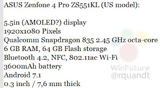 According to latest leaks, Asus Zenforne 4 Pro will sport 5.5 inches FHD AMOLED display.It is powered by SD835 chip coupled with 6GB RAM and 64GB internal storage which can be expanded via microSD card.