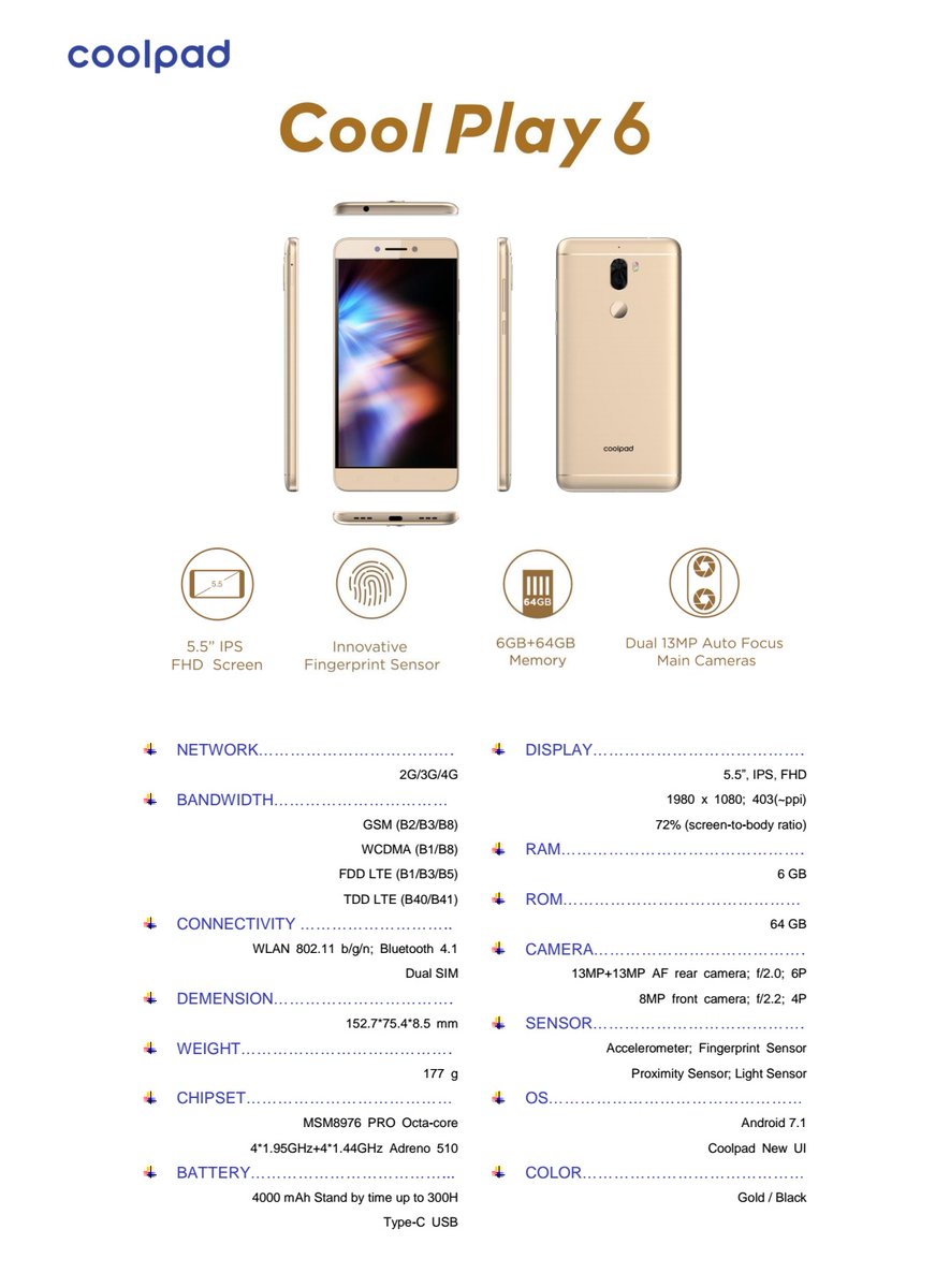 The connectivity options include USB Type-C port at the bottom, Dual-SIM with 4G LTE and VoLTE support, Wifi, Bluetooth 4.0, GLONASS and A-GPS.All this is fueled with 4000 mAh battery and the device is running Android 7.1.1 with a custom skin on top.So what do you think of this Cool Play 6? Leave your comments below.