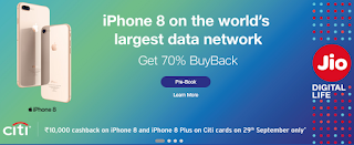 The launch offers include Rs.10000/- cashback for Citi Bank credit and World debit card, users if you pre-order the device and Reliance Jio is also offering 70% buyback value if you return the iPhone 8 or iPhone 8 Plus after one year of usage and is only applicable if you purchase the device from Amazon and Jio website and Reliance Digital Outlets and the offer starts from Sept 29 to Dec 31.