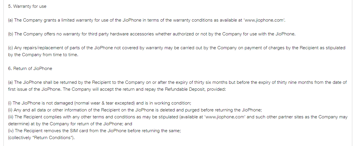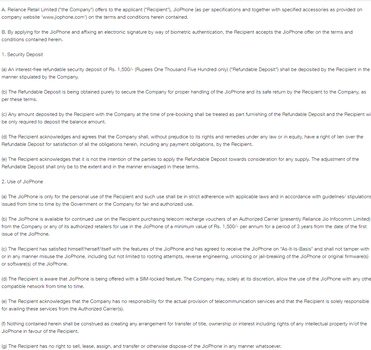 Reliance Jio had recently added the latest terms and conditions about the most awaited effectively free JioPhone.As per terms and conditions, the JioPhone will be effectively free for that you need to do a security deposit of Rs.1500/- which is the same as per earlier terms and conditions.Apart from that, there is some shocking truth of the JioPhone terms and conditions with you have to use it for personal use only and misusing of the device leads to penalty with JioPhone will be taken back.