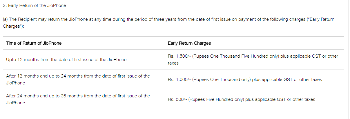 The third shocking fact is Early Return Charges that we were told that after three years we will get back the security deposit of Rs.1500/- and if you planning to return within 12 months from date of purchase will have to pay Rs.1500+18%GST= Rs.1770/-.If you continue using the device for from 12-24 months then you return the device will have to pay extra Rs.1000 with GST and if you return the device from 24-36 month period you will have to pay Rs.500/- plus GST back so again it is shocking.If you need complete refund then you have to use the device for 36 months and device conditon must be good without any scracthes and damages.