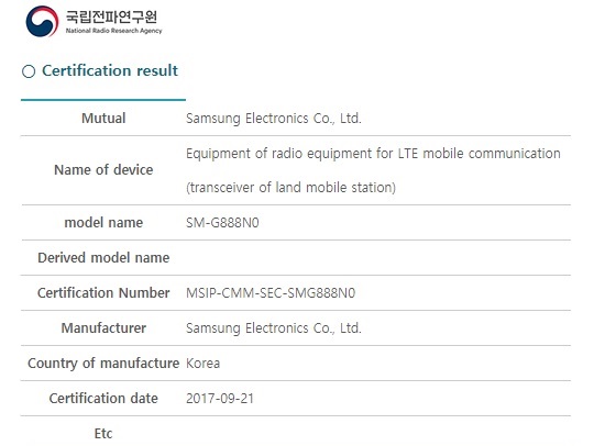 Earlier we even got the same model number with Samsung SM-G888N0 spotted in Wifi Alliance in April and also in Bluetooth SIG certification in the month of July.Unfortunately, there are no details leaked of the device from NRRA.The listing on NRRA has just highlighted the purpose of the device, Samsung branding and the Certification date.Passing through NRRA certification the device might be only available in South Korea as there are no details about the whether Samsung will make the device available globally.