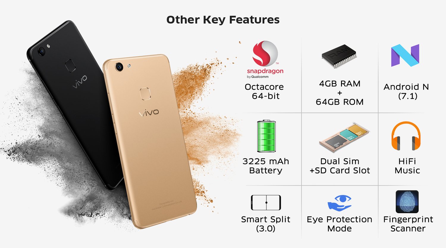 The Vivo V7+ is powered by SD450 chip which is the newest entry level chip from Qualcomm coupled with 4GB RAM and 64GB onboard storage which can be expanded via microSD card slot up to 256GB.