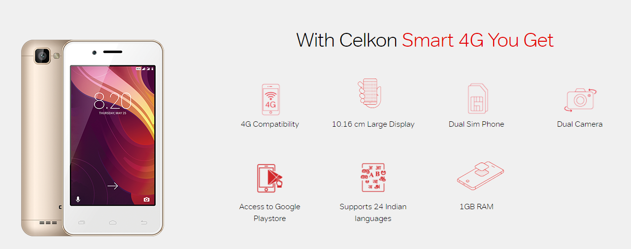 Celkon Smart 4G smartphone sports 4 inches WVGA display having a resolution of 800*480p. It weighs 119 grams and is 11mm thick. It is powered by a Quad-Core processor clocked at 1.3GHz and coupled with 1GB RAM and 8GB internal storage which can be expanded via microSD card up to 32GB.