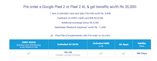 As per Reliance Jio, if you pre-order either Google Pixel 2 or Google Pixel 2 XL via Jio website then you are eligible to get benefits from Jio which is worth Rs.35,000/-.So the benefits are applicable for Reliance Jio users only for both existing and New users.Under this scheme, the user will get 1 year (360 days) of free unlimited calls, SMS, and 750GB of 4G Data which will be downgraded to 64KBPS later which is worth Rs.9999/-, Additional cashback of Rs.8000/- if you buy the device under HDFC Credit card EMI scheme which will be credited after 90 days, Extra Rs.5000/- off if you exchange your old smartphone and do note that exchange offer is only applicable select brands like to Google Nexus and Pixel devices, Samsung devices, Motorola and Apple smartphones and also you will get Sennheiser Headphones for worth Rs.11,990/- for Rs.1 is applicable only if you pre-order the device now .