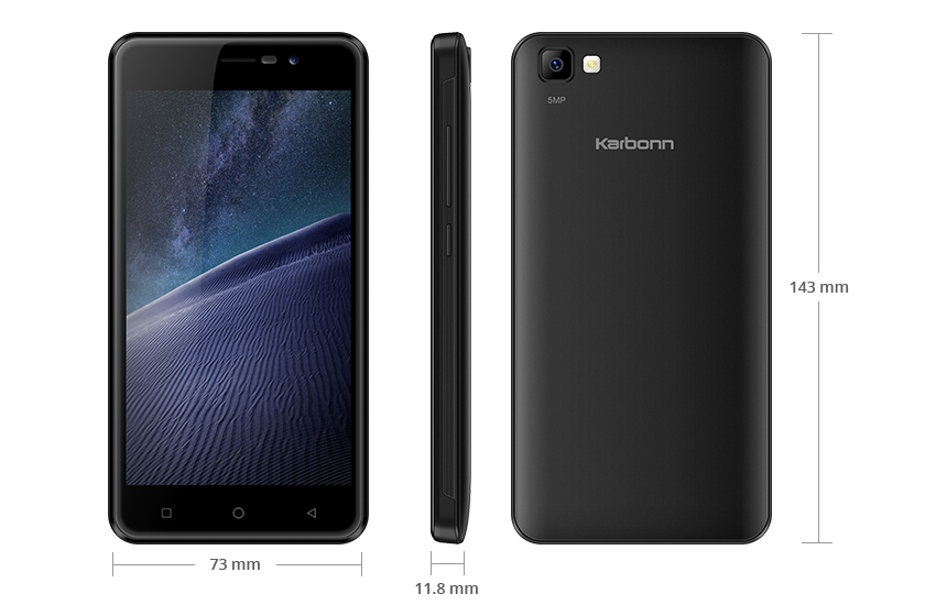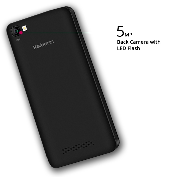 Karbonn K9 Smart Selfie is completely built out of plastic and weighs 172 grams. It is 11.8 mm thick.Karbonn K9 Smart Selfie sports 5 inches WVGA display having a resolution of 480*854p covered with 2.5D curved Glass and Super Tough Glass.It is powered by unknown SoC clocked at 1.1 GHz coupled with 1GB RAM and 8GB onboard storage which can be expanded via MicroSD card (Dedicated slot).