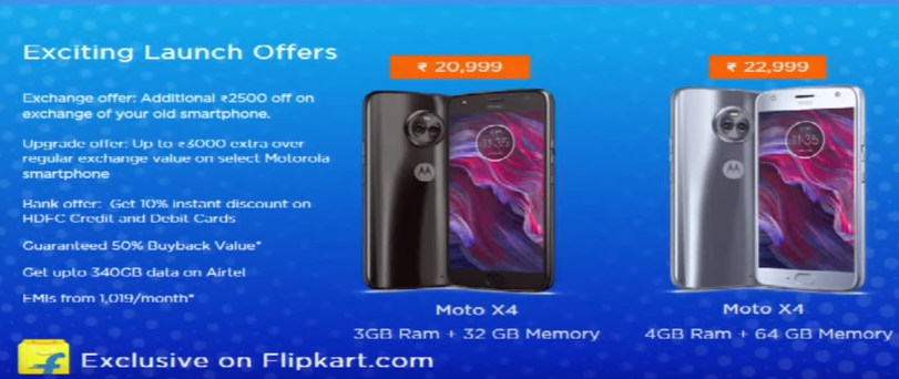The launch offers include extra Rs.2500/- off in exchange with an old smartphone, extra Rs.3000/- off in exchange for Motorola smartphone, Flipkart Buyback value up to 50%, 10% cash back for HDFC Bank Credit and Debit card user, Extra 340GB of 4G Data from Airtel and No Cost EMI.