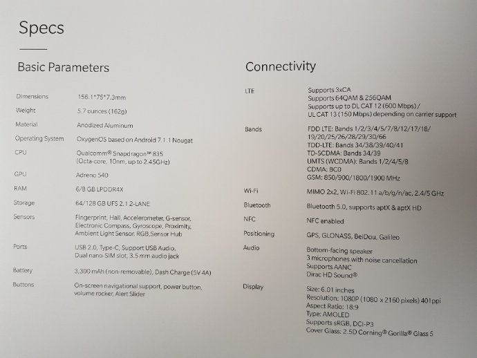 As per leaked images, we can see the brochure which might have been included in the review kit.The Brochure also confirms the bezel-less display having an aspect ratio of 18:9 when compared with 16:9 on OnePlus 5.As per Brochure, the OnePlus 5T sports 6.01 inches Full optic FHD+ AMOLED display which company touts as Sunshine Display.It also comes with 2.5D curved glass on top.The OnePlus 5T weighs 162 grams and is 7.2 mm thick.