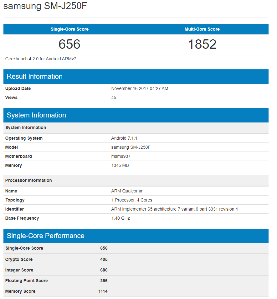 As per listing on GeekBench, the Samsung Galaxy J2 Pro (2018) is having model number SM-J250F. It is powered by SD430 chip clocked at 1.4 GHz coupled with 1345MB RAM which might be 2GB or 1.5GB RAM.The device is running on Android 7.1.1 with Samsung custom UI on top.Samsung Galaxy J2 Pro (2018) will be Dual SIM device.