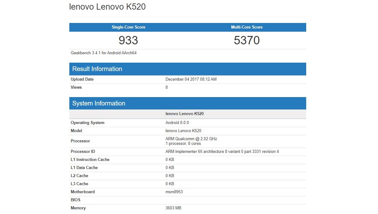 As per listing on GeekBench, the Lenovo K520 is powered by Snapdragon MSM8953 aka SD625 chip clocked at 2.02 GHz coupled with 4GB RAM. It is running on latest Android 8.0 out of the box.