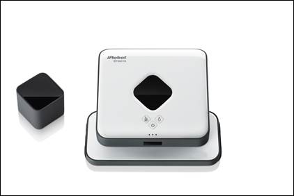 Braava 390t is an ultramodern floor cleaner that features an ivory-colored, square-shaped robotic floor mopping device. Its unique design is further contrasted with a black, diamond-shaped glass that adds an exceptional depth to its visual appeal.