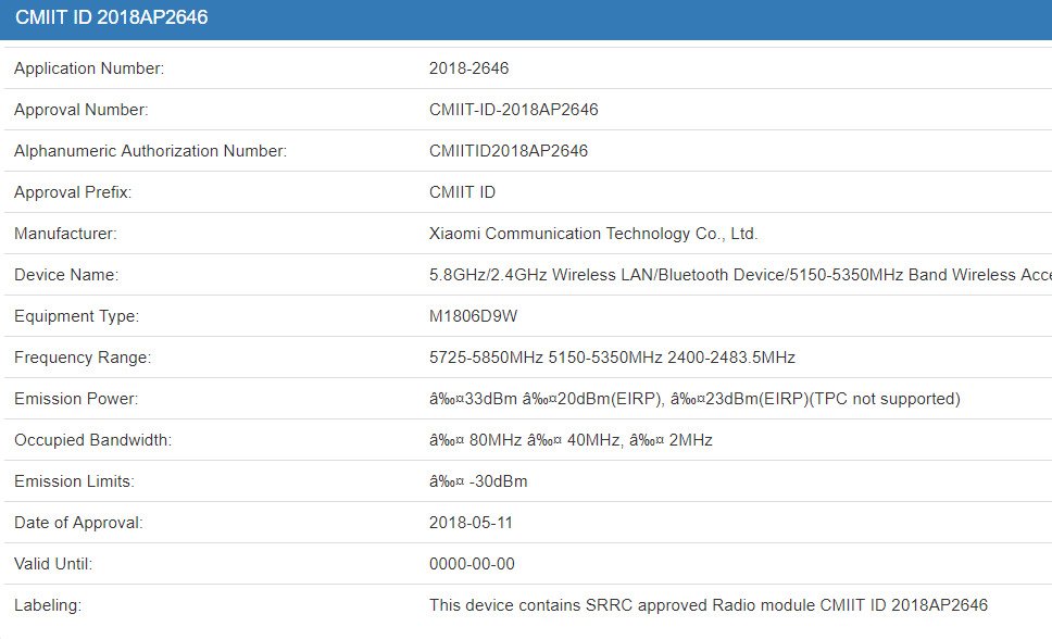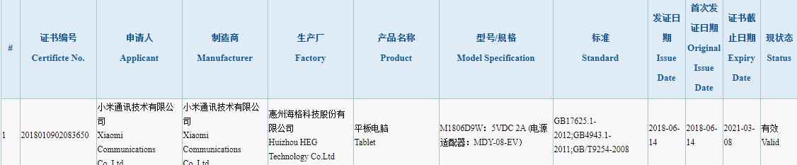 Today, we have finally spotted the device passing through Chinese certification with 3C. As per the 3C listing, the Mi Pad 4 is listed as M1806D9W. The 3C listing mentions the alleged M1806D9W is a tablet and will support 5V/2A normal charger.