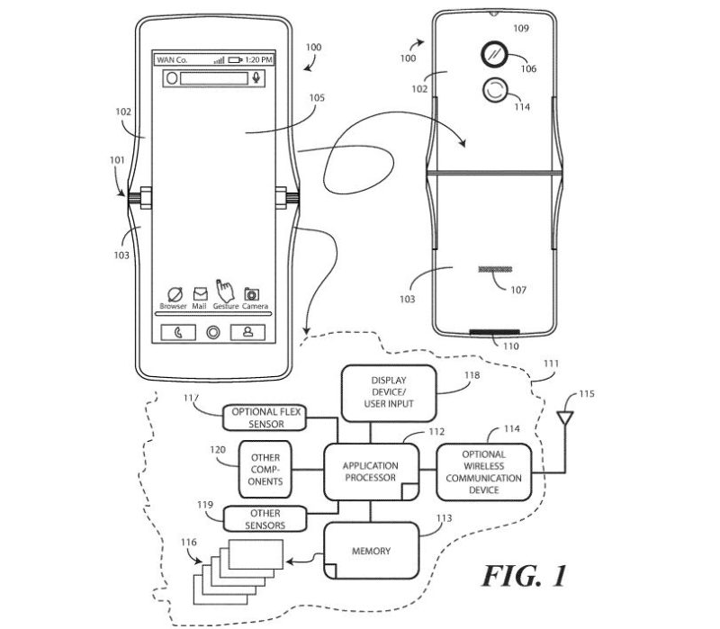 As per the sketches we can expect the Motorola foldable phone will have flip-phone like form factor with single display bent with the help of hinge. The upper half of the back will come with a rear camera and loudspeaker on the bottom of the device. The new patent also mentionsĀ an optional flex sensor which might be used to detect the phone is folded or not.