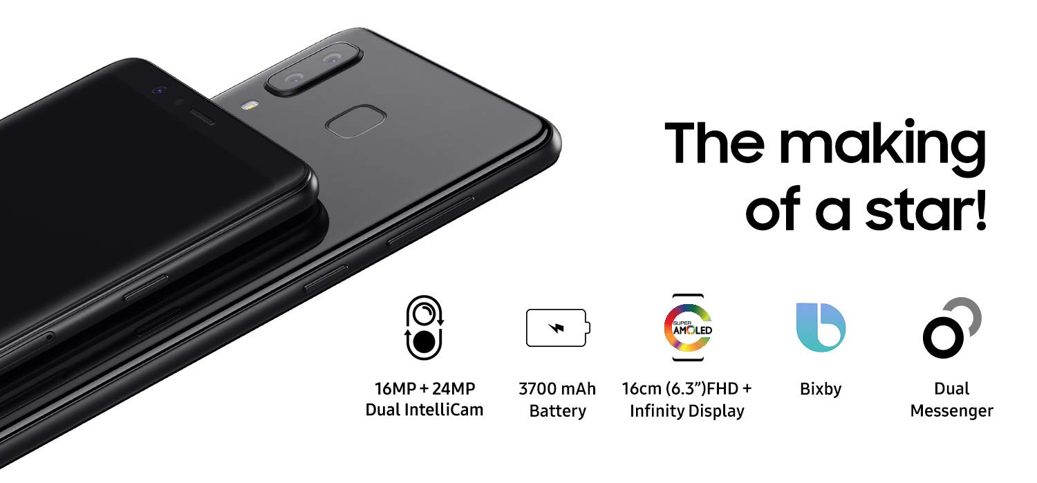 The super slim Samsung Galaxy A8 Star sports larger 6.28 inches FHD+ Super AMOLED Infinity display with an aspect ratio of 18.5:9. It is powered by SD660 SoC coupled with 4GB RAM & 64GB internal storage which can be expanded via microSD card up to 256GB.