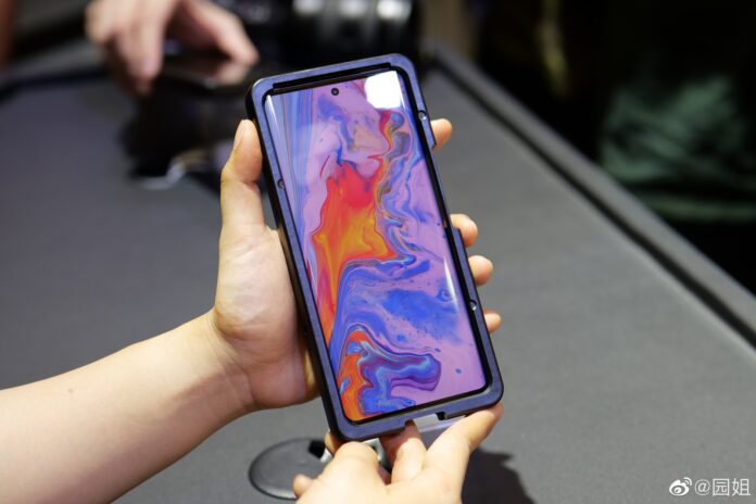 Last week’s convention photos only showed a phone portion, as it was covered in security enclosures. Only the front and a small part of the bottom were visible. The display has dual-curved edges. The bottom edge of this phone is flat.
