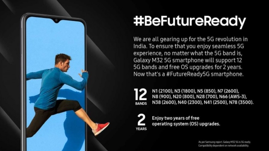 Samsung will offer two years of OS upgrades with the smartphone that runs Android 11. In addition, the Galaxy M32 5G will support 12 5G bands and feature Knox Security.