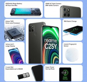 The new Realme C25Y will also look similar to Realme C25 without any major changes in terms of design. The new Realme C25Y will sport 6.5 inches HD+ IPS LCD display with a waterdrop notch. It is powered by a 12nm UNISOC T610 processor coupled with 4GB RAM and 64GB storage.