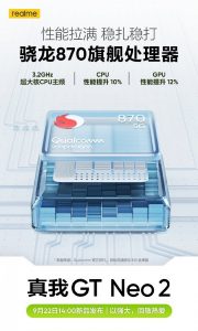 The Realme GT Neo2 was said to include a Snapdragon 870 SoC, 5,000 mAh battery, and 65W charging. Realme has now officially verified these specifications by sharing two posters on Weibo to promote the upcoming GT smartphone.