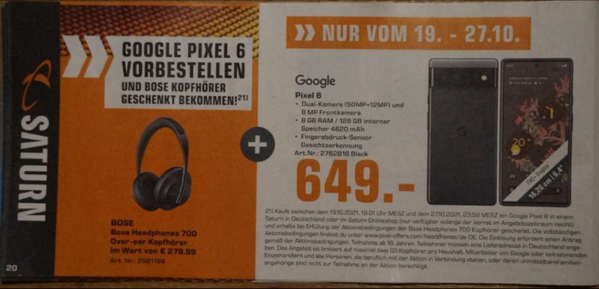 The picture also showed that pre-orders for the Pixel 6 would include the €279.99 (Rs.25,000/-) Bose 700 headphones. The phone will reportedly cost $749 (Rs.56,000/-) in the US. The deal is available through October 27, confirming the October 28 release date rumor. The same vendor offers a Pixel 6 screen protector.
