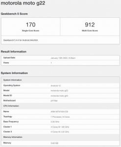 As per the source, the Moto G22 was now spotted on Geekbench which reveals the specs of the device. The alleged Moto G22 is now running on Android 12 OS out of the box. The device is now powered by outdated MediaTek Helio G35 SoC coupled with 4GB RAM and probably 64GB internal storage space.