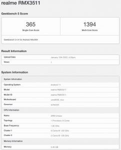 The new Realme C35 comes with 4GB RAM and probably got 64GB internal storage space. The device managed to score 365 under single & 1394 under the multi-core test. No word about the battery and other details. We expect the new Realme C35 might soon launch in India in the coming weeks.