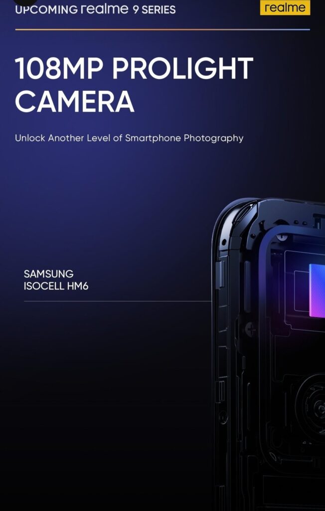 In the past, we saw leaks revealing that Realme will soon launch yet another Realme 9 series smartphone in India soon. Now ahead of the launch Realme has officially confirmed that they will soon introduce a new smartphone featuring the latest Samsung ISOCELL HM6 108MP sensor.