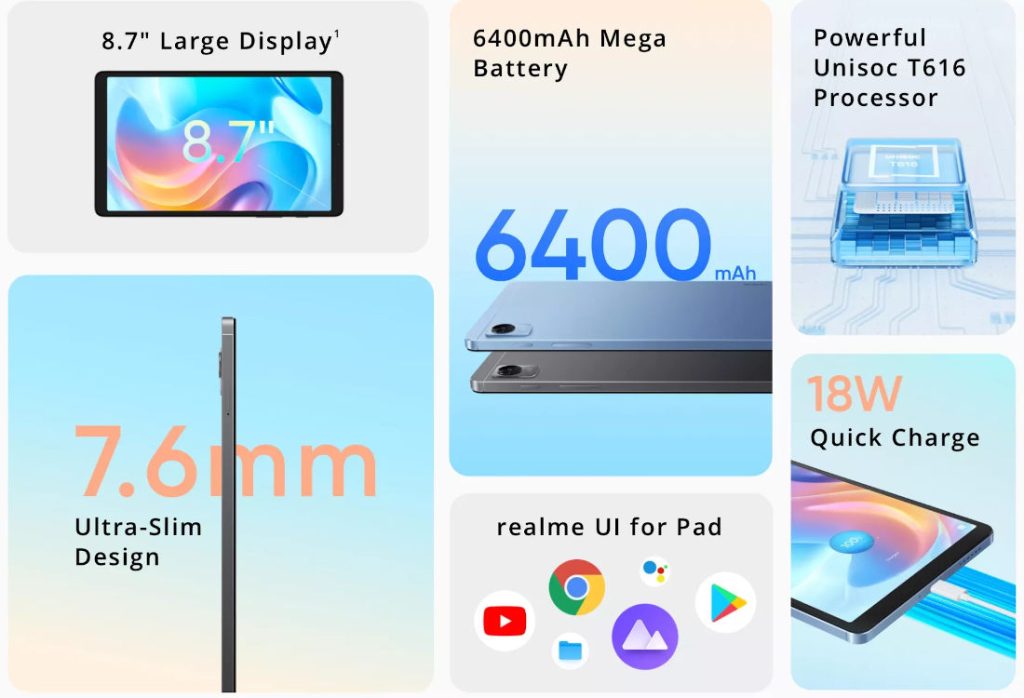 The new Realme Pad Mini will sport 8.7 inches HD+ display with a resolution of 1340 x 800px. The new Realme Pad Mini will be powered by Unisoc T616 SoC coupled with 3GB/4GB RAM and 32GB/64GB storage.