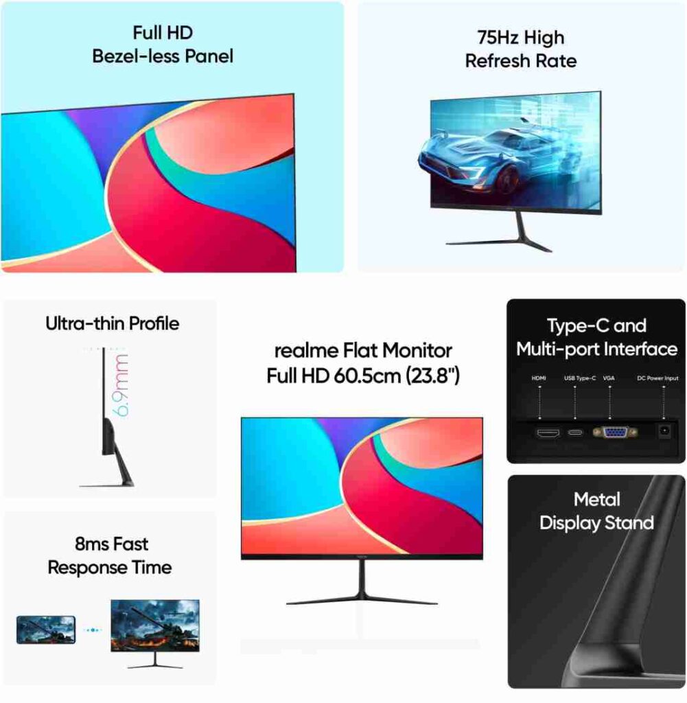 The new Realme Flat Monitor Full HD will come with 23.8 inches FHD LED display along with whopping 75Hz refresh rate support. Further, the monitor uses a VA panel & comes with 250nits of brightness with a 16:9 aspect ratio & anti-glare display.