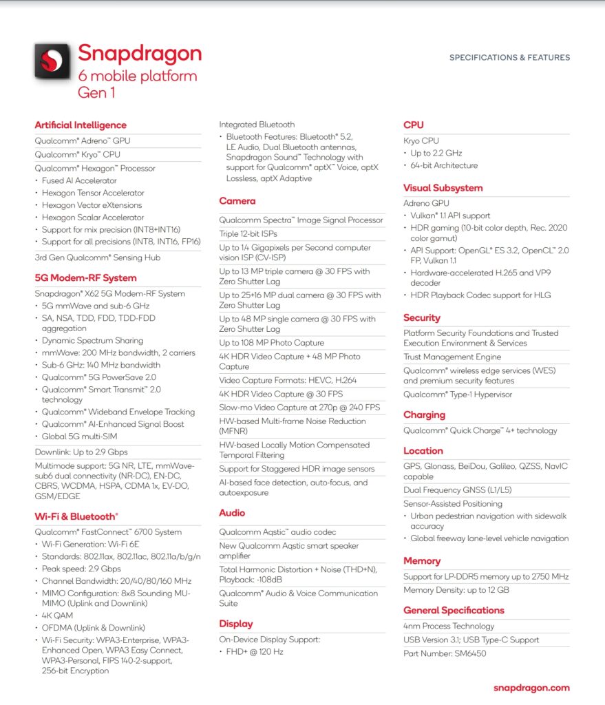 Now tipster Evan Blass has managed to get the press release of the upcoming Snapdragon 6 Gen 1 SoC. The new Snapdragon 6 Gen 1 SoC will be arriving with a 2.2 GHz clocked Octa-core Kyro CPU. It is built on a 4nm process which makes it more power efficient than its predecessor. The chipset also gets support for the latest LPDDR5 RAM with support of up to 12GB.