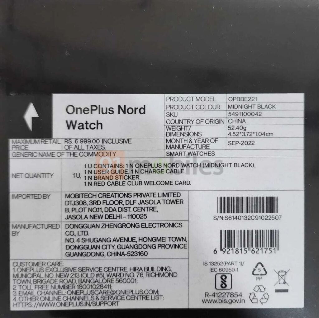 The retail box pictures reveal the OnePlus Nord Watch’s maximum retail price in India. OPBBE221 is the model number of the device imported from China. With 100+ customizable watch faces, a 1.78-inch AMOLED panel, and 105 sports modes, the OnePlus smartwatch is sure to please.