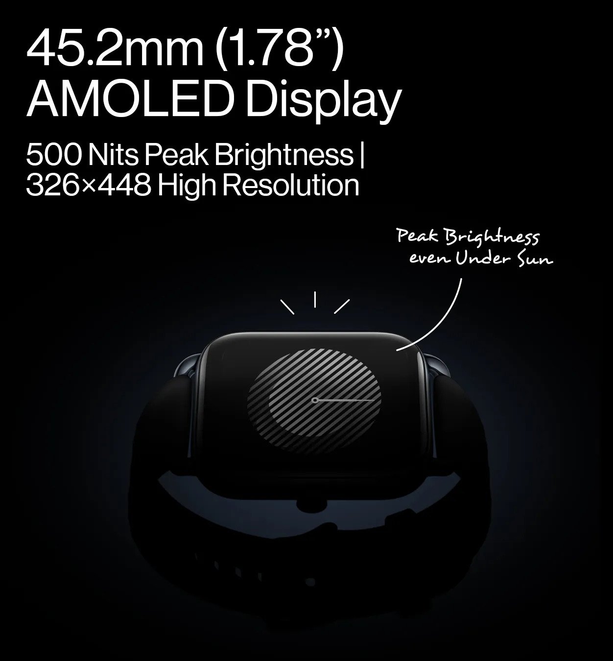 OnePlus announced that its Nord smartwatch will feature a 1.78-inch AMOLED display. The display panel has a resolution of 368 x 448 pixels and a peak brightness of 500 nits.