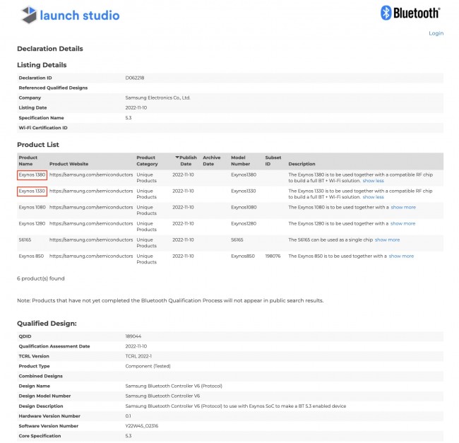 These two SoCs are listed on Bluetooth SIG as supporting Bluetooth 5.3. Samsung Bluetooth Controller v6 will be used to support Bluetooth 5.3.