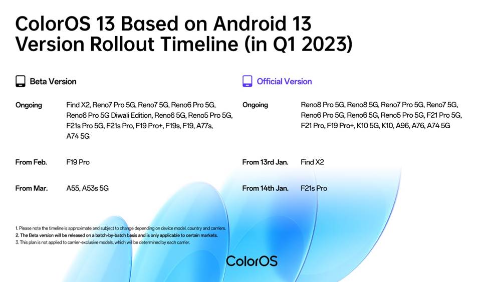The ColorOS 13 Beta version of OPPO is also currently rolling out to the Find X2, Reno7 Pro 5G, Reno7 5G, Reno6 Pro 5G, Reno6 5G, Reno5 Pro 5G, F21s Pro 5G, F19 Pro+, F19s, F19, A77s, and A74 5G handsets. In February 2023, it will be rolled out to the F19 Pro. This update will also be available in March 2023 for the OPPO A55 and A53s 5G.