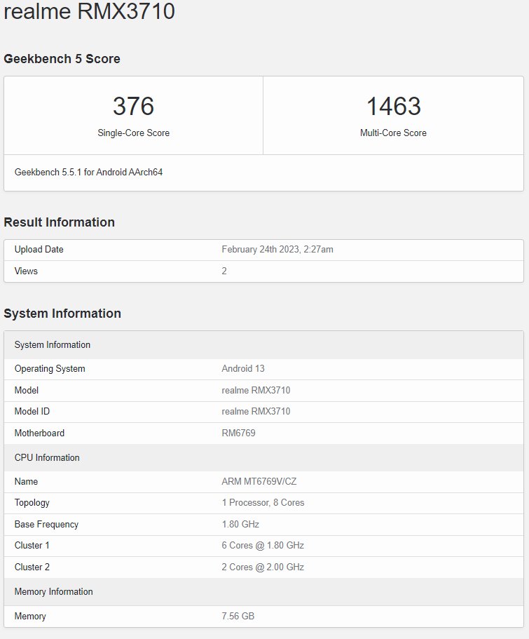 In addition to 8GB of RAM, the device runs on the Android 13 operating system. This phone will most likely come with Realme UI 4.0. According to Geekbench 5, the device scores 376 points on the single-core test and 1463 points on the multi-core test. Other features are not disclosed in the listing.