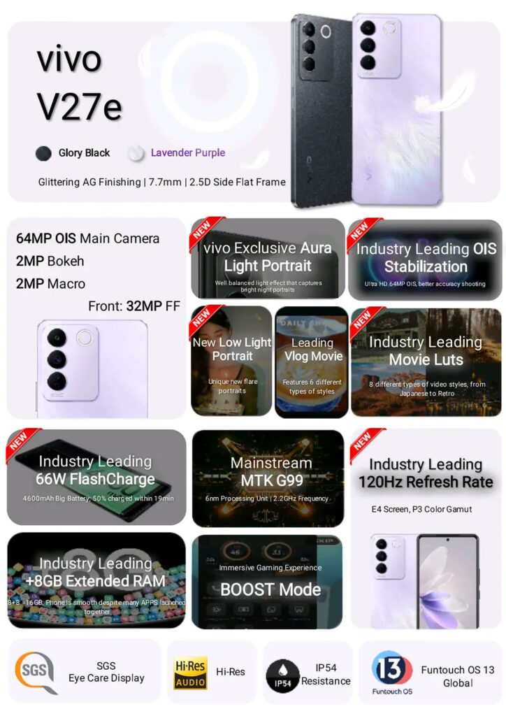 Vivo V27e will sport 6.62 inches FHD+ AMOLED E4 display with a 120Hz refresh rate. It measures 7.8mm thick and weighs 186g. The device comes in Glory Black and Lavender Purple colors.