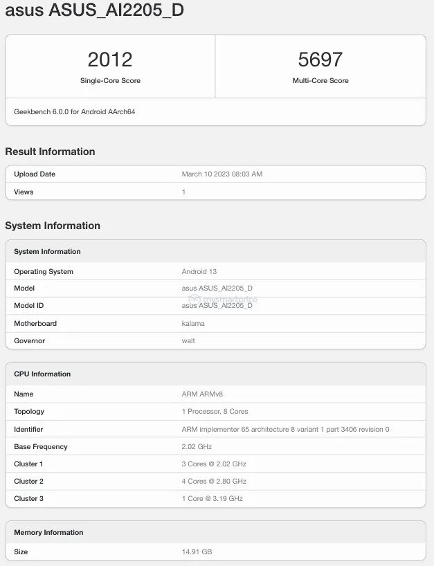 Geekbench lists the ASUS ROG Phone 7D (AI2205_D) as having Snapdragon 8 Gen 2 processor. Besides 16GB of RAM, the phone will run Android 13 out of the box. The handset scored 2012 points in the single-core test and 5697 points in the multi-core test on Geekbench. These are only the details revealed by the preliminary Geekbench results.