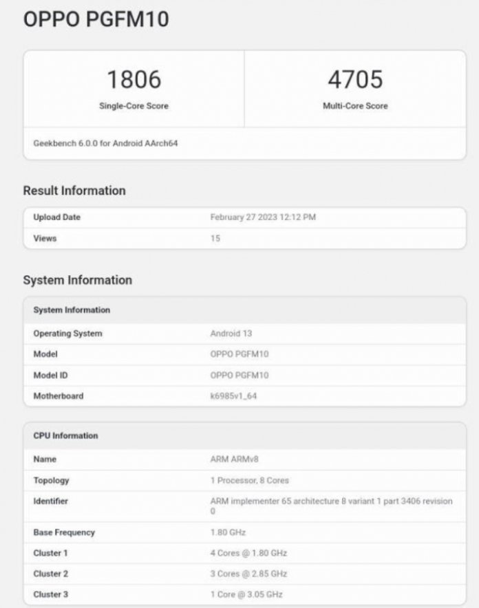 According to GeekBench, an OPPO smartphone with model number OPPO PGFM10 has been listed. OPPO Find X6 is the device. The single-core score is 1806 and the multi-core score is 4705. The listing also confirms that the device will be powered by the MediaTek Dimensity 9200 5G chipset. As per the website, it has an octa-core processor clocked at 3.05GHz, a performance processor clocked at 2.85GHz, and a power-saving processor clocked at 1.80GHz.