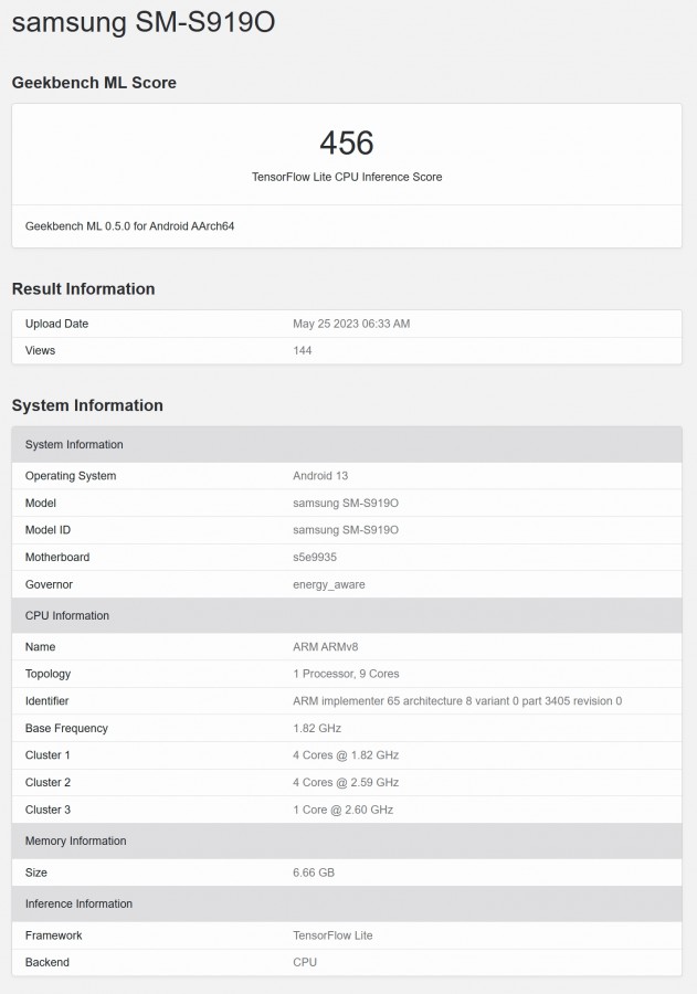 We last heard about the Exynos 2300’s 9-core CPU setup, which featured a Cortex-X3 core clocked at 3.09 GHz, four Cortex-A715 cores clocked at 2.65 GHz, and four Cortex-A510 cores clocked at 2.1 GHz. The SM-S919O model number appears on GeekBench with a very similar 1+4+4 chip. Although the reported CPU frequencies don’t match the expected ones, that’s pretty normal for pre-production hardware. Considering the Exynos 2200 uses a 1+3+4 configuration, while the Exynos 2400 is expected to feature a 1+2+3+4 configuration with a Cortex-X4.