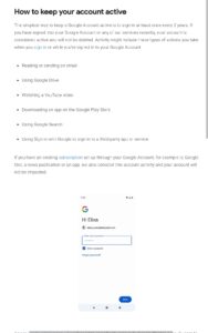 When an account becomes inactive, Google suggests assigning a recovery email and using the Inactive Account Manager. Through this tool, you can send files to trusted contacts, set up an autoresponder in Gmail, or delete your account.