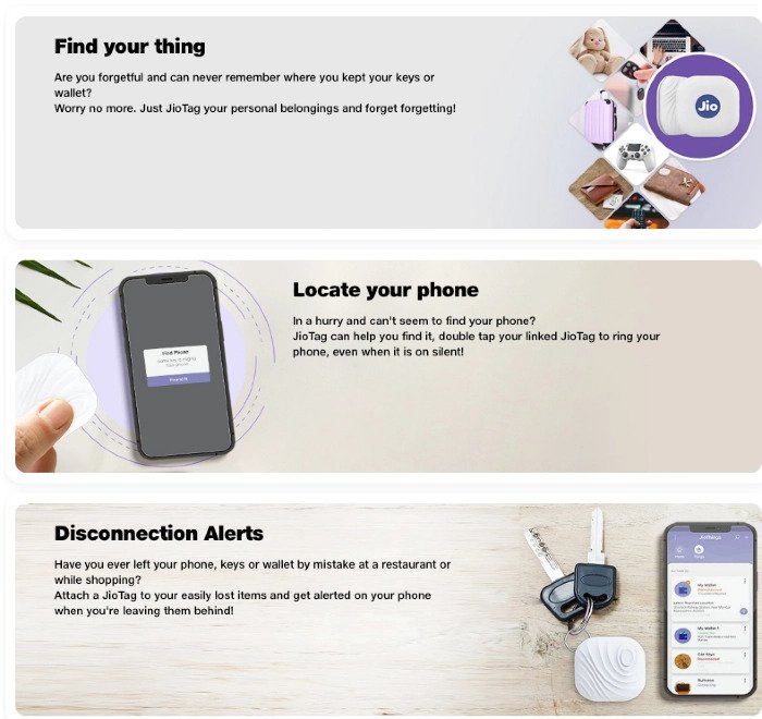 Misplaced items can be located using JioTag. Double-tap the JioTag to ring the phone, even in silent mode. If users leave their wallets, keys, or other belongings behind, JioTag will alert them to their exact location.