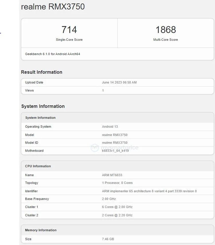 According to Geekbench, the Narzo 60 5G has 8GB of RAM. Realme will probably launch the phone with 4GB or 6GB of RAM too. It’s likely to have 64GB or 128GB of storage. The phone will also run Android 13 out of the box with Realme UI 4.0 on top. Geekbench 6 gave the Narzo 60 5G 714 and 1868 points, respectively.