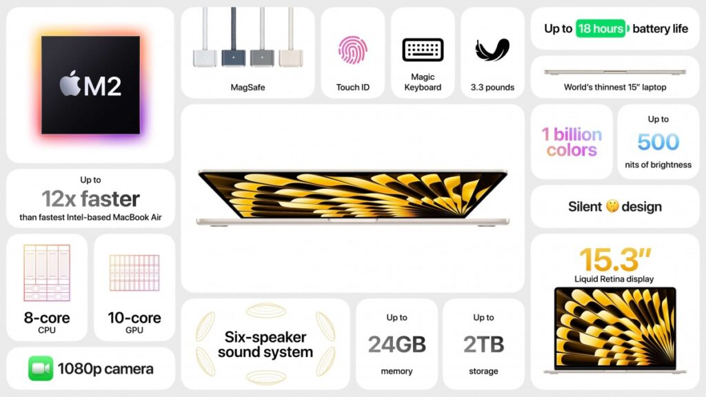 The new 15-inch MacBook Air is 12x faster than the ‘fastest Intel-based MacBook Air’ and twice as fast as the ‘best-selling 15-inch PC laptop with a Core i7 processor’, according to Apple.