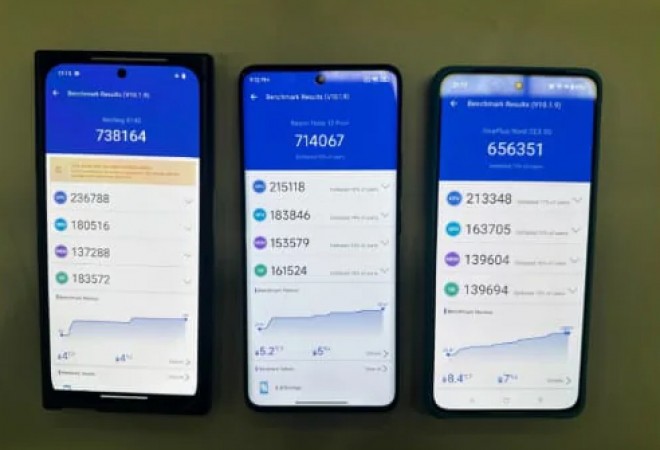 With 236,788 points on the CPU test and 180,516 points on the GPU test, phone (2a) (first from left to right) scored 738,164 on AnTuTu 10. Additionally, 137,288 points were scored on the memory portion of the test, and 183,572 points on the UX portion. MediaTek Dimensity 7200 is the chipset on Phone (2a), according to recent leaks.