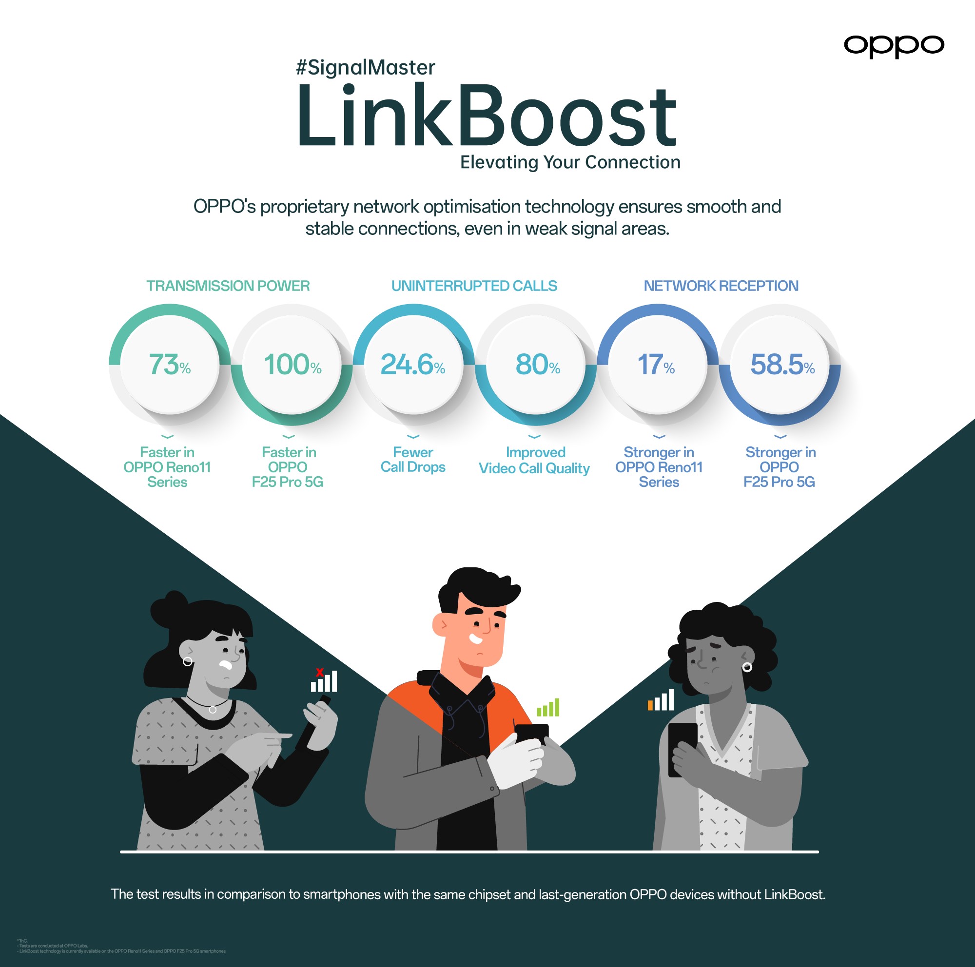 OPPO F25 Pro 5G offers up to 100% faster transmission power and 58.5% stronger reception compared to similar smartphones without LinkBoost, while OPPO Reno11 Series provides up to 73% faster transmission power.